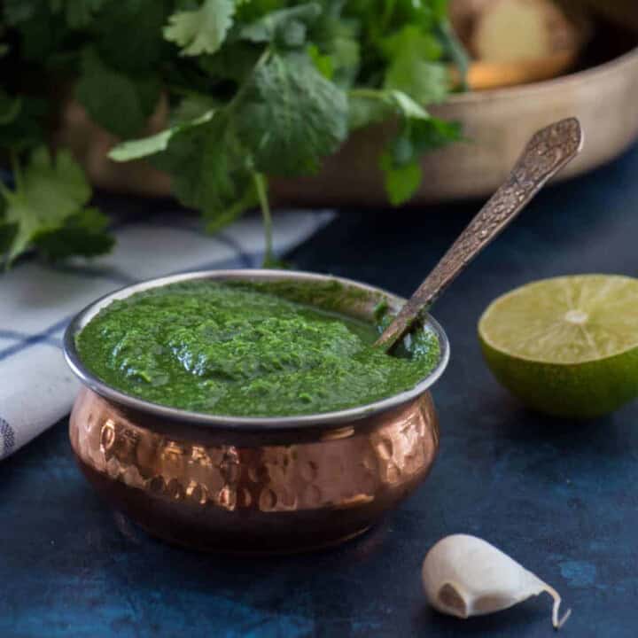 Coriander mint chutney is this tangy green chutney that most Indian snacks can't do without. This dipping sauce made from fresh cilantro and mint leaves comes together in less than 10 minutes!
